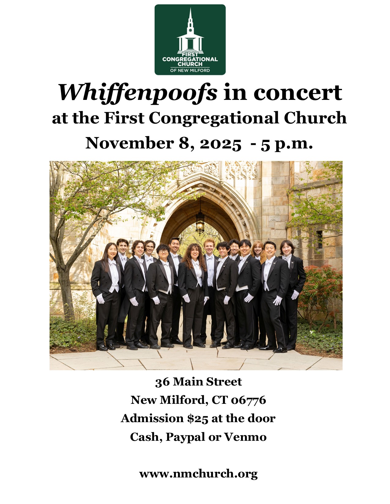 The original college a cappella singing group from Yale is performing at our church on November 8. Founded in 1909, they will offer a delightful early evening concert. Proceeds will benefit the church's Steeple Repair fund. Tickets are $25 at the door. More about the Whiffenpoofs