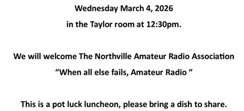 Guest Speaker: Northville Amateur Radio Association Potluck Luncheon, please bring a dish to share. RSVP FOR THE LUNCHEON |